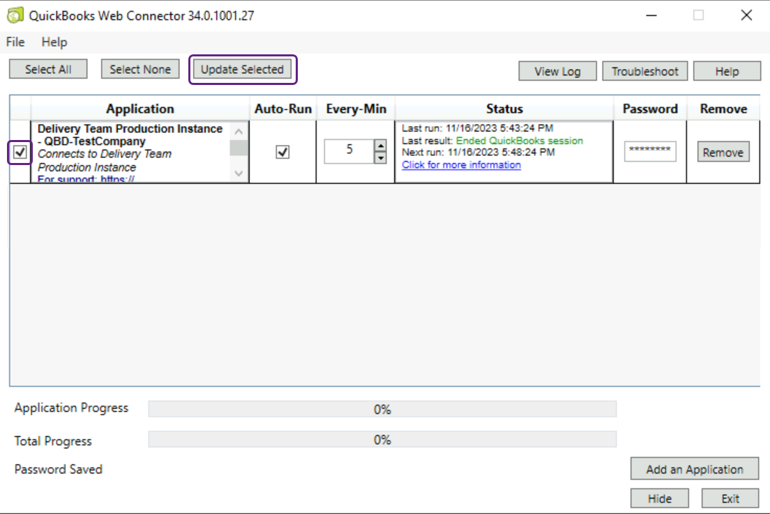 Once the user allows the connector access to the open QuickBooks Desktop companyCompany In Codat, a company represents your customer's business entity. Companies can have multiple connections to different data sources., they will see a new connectionConnection A link between a Codat company and a data source (like an accounting platform). Each connection represents authorized access to pull or push data from that platform. appear in the web connector. The user must then select the connectionConnection A link between a Codat company and a data source (like an accounting platform). Each connection represents authorized access to pull or push data from that platform. using the checkbox.